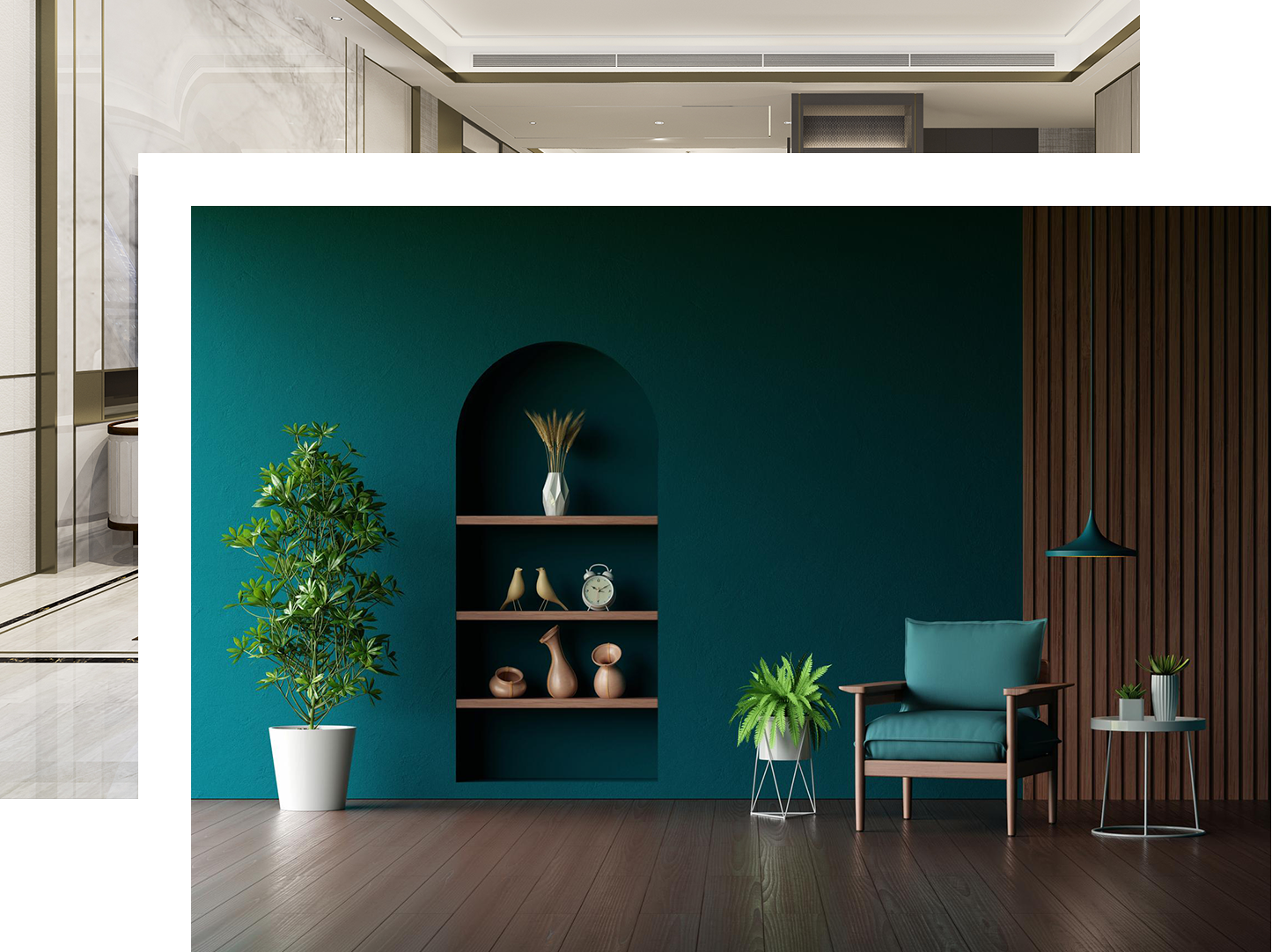Interior services include space planning, furniture layout, lighting design, material selection, ceiling work, flooring, wall finishes, décor styling, and functional space optimization.